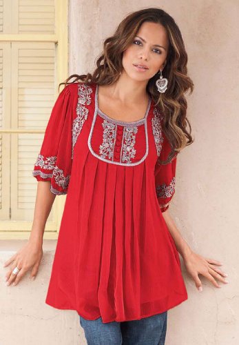 Polyester chiffon with voile 100% Cotton lining. Hand wash. Imported. By Denim 24/7® Poet sleeves fall elow elbow with embroidery and braided trim detail Lace trim on bib, neckline, armholes and cuffs Trapeze shape About 29" Plus size tops, tunics - embellished tunic by denim 24/7, in sizes 12W to 32W
