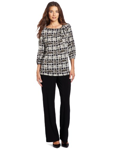 Geometric overprinted abstract tunic top, asymetrical tie neckline, 3/4 sleeve, over solid matte jersey pant